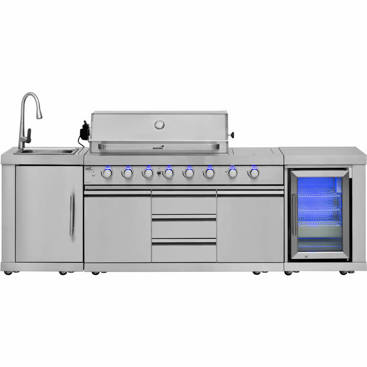 Mustang Ametist 6+2 er et komplet udekøkken i rustfrit stål, der inkluderer en stor gasgrill med seks hovedbrændere og to sidebrændere. Det har også en integreret vask og rigelig opbevaringsplads, hvilket gør det ideelt til større sammenkomster.