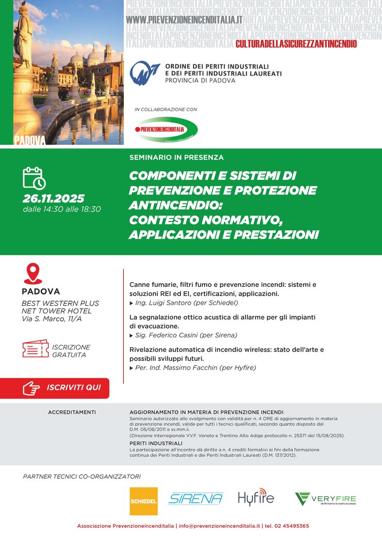 26 novembre a Padova con l'Ordine dei Periti Industriali e Prevenzione Incendi Italia per parlare di sicurezza antincendio e canne fumarie.