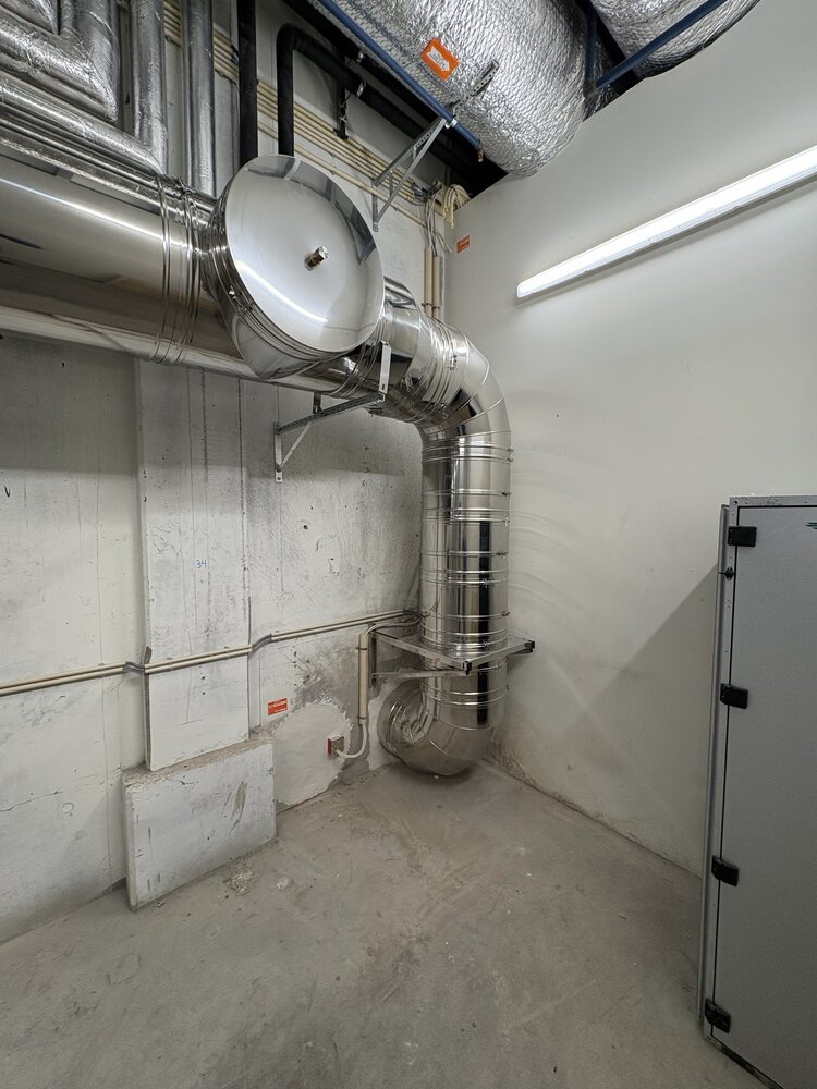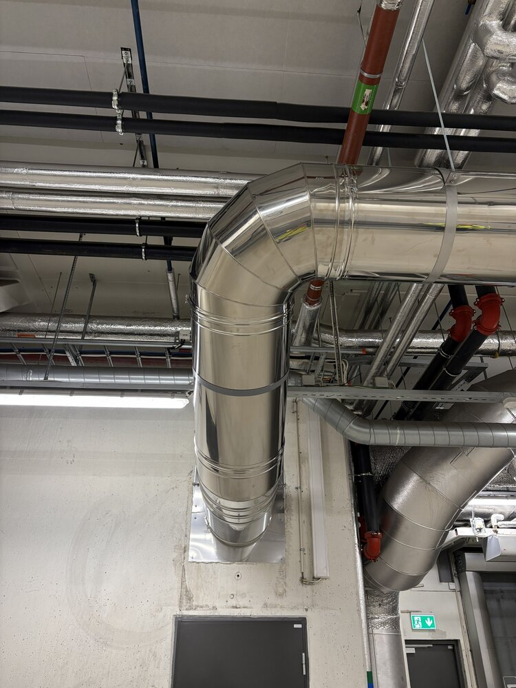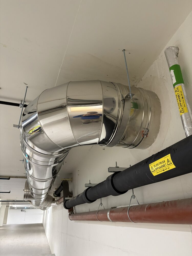 Med utgangspunkt i prosjektets utfordringer og krav anbefalte Ventistål og vi i Schiedel ICS 5000 som nytt stålpipesystem på Oslo Lufthavn. Stålpipipesystemet oppfylte kravene til EI120 brannmotstand i gjennomføringer gjennom brannceller og ga samtidig den nødvendige fleksibiliteten for å håndtere komplekse rørføringer og mange retningsendringer. Justerbare rør og bend ble benyttet for å tilpasse løsningen til byggets ulike soner og brannceller.