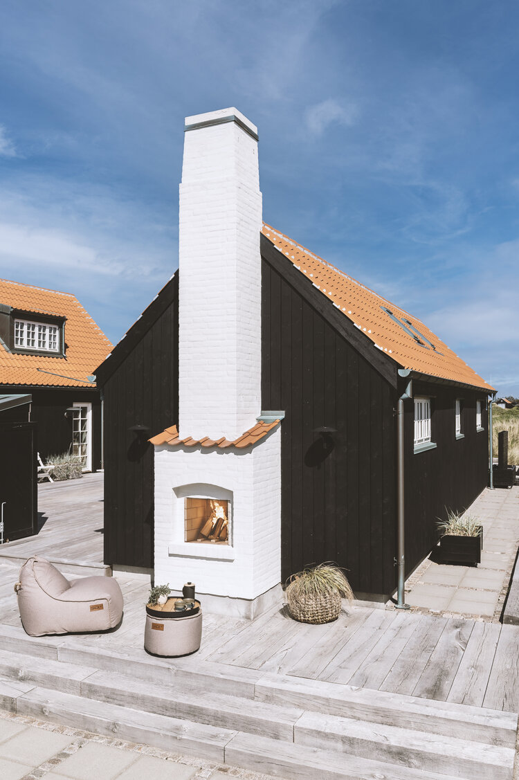To sommerhus i Skagen har fått unike hagepeiser som er tilpasset husenes klassiske arkitektur. Med hvit skalmuring, røde takstein og forhøyede skorsteiner gir peisene både funksjon og en hyggelig ramme rundt uteområdene.
