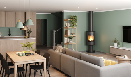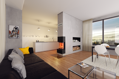 Trójstronny wkład kominkowy z całkowicie niezależnym obiegiem powietrza przy jednoczesnej pracy kontrolowanego systemu wentylacji pomieszczenia.
