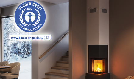 Rohový krb pod komínom, s vysúvateľnými dvierkami. Minimálny záber miesta. Získal Modrého anjela - jednoznačný dôkaz o úspornosti a čistej prevádzke
