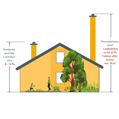 Komínové teleso, tým, že je vyššie nad strechou umožní výrazne lepšie rozptýlenie spalín. Naviac, pri správnej voľbe komína, môže bez dodatočného vložkovania privádzať aj vzduch ku kotlu.