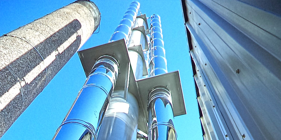 The primary challenge was the logistical complexity of working within an existing concrete chimney. In phase one, the team had to perform a "top-down" installation, hoisting 1000mm pipe sections through narrow central access openings. Additionally, engineers had to navigate 45° rolling offsets for horizontal runs and execute precise 90° transitions to exit the Energy Centre, all while ensuring the new components integrated perfectly with the site's established architectural layout.