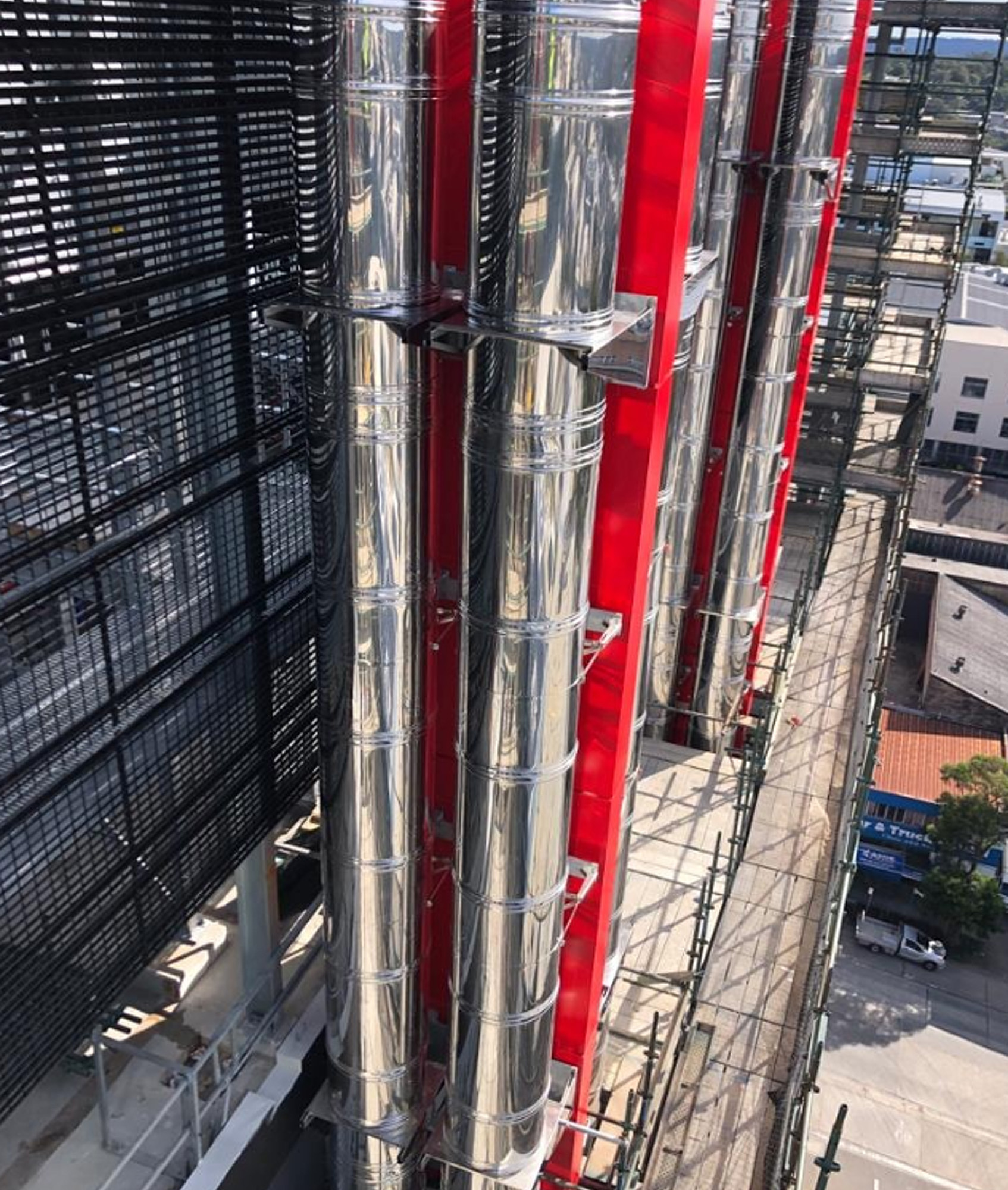 Schiedel’s engineering team was tasked with designing thirty-two individual flues. Each flue featured a 600mm nominal internal diameter and a high-gloss stainless steel finish, specifically designed to run vertically along the building’s exterior.